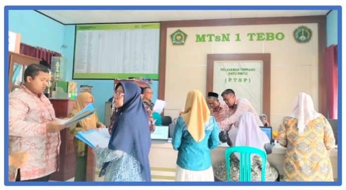 Kondisi ramai lancar ini membuktikan bahwa kesadaran tertib administrasi di lingkungan MTsN 1 Tebo semakin meningkat. Petugas PTSP pun disiagakan secara penuh untuk memastikan seluruh kebutuhan administrasi, baik bagi guru, siswa, maupun wali murid, dapat terlayani dengan tuntas sebelum jam kantor berakhir.*SJ