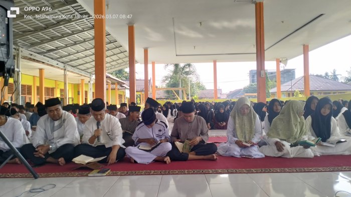 Tebo - MTsN 1 Tebo giat Literasi Al-Qur'an melalui Tadarus selama Ramadhan puncak kegiatan ini digelar dengan Khatmil Quran pada 7 Maret 2026. Acara ini dipusatkan di aula Madrasah dan dipimpin oleh Zulkarnain S.Ag, yang juga bertindak sebagai ketua pelaksana. Seluruh warga Madrasah, mulai dari siswa, guru, hingga staf, turut hadir dan berpartisipasi dalam kegiatan literasi tersebut