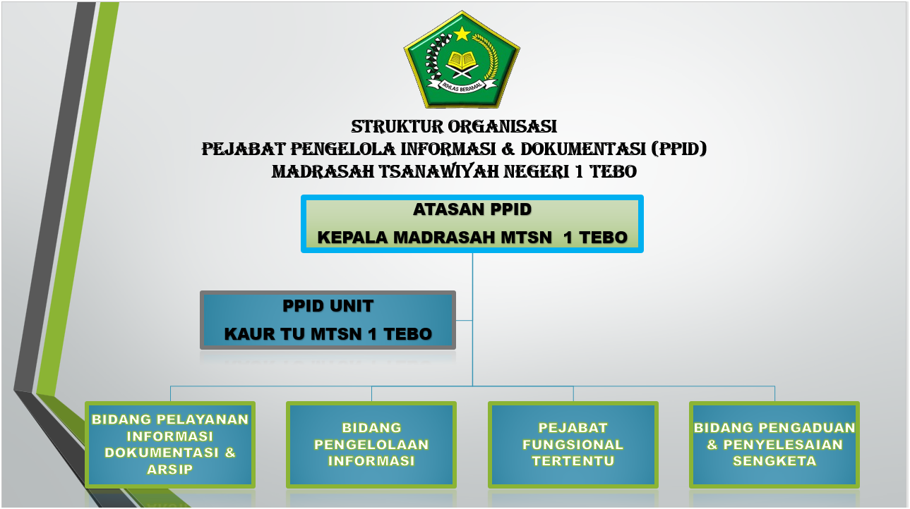 Pejabat Pengelola Informasi dan Dokumentasi (PPID) MTsN 1 Tebo dibentuk sebagai perwujudan amanat Peraturan Pemerintah Nomor 61 Tahun 2010 tentang Pelaksanaan Undang-Undang Nomor 14 Tahun 2008 tentang Keterbukaan Informasi Publik.